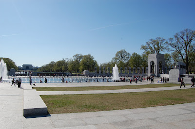 We then set out towards the Lincoln Memorial. Got a great view of the Jefferson Memorial while walking. On the way we stopped at the National World War II Memorial. I don't think this was here the last time I came through DC years ago. It's an oval shapped memorial with a pool in the center that is flanked by two fountains. Each end of the oval represents the "Atlantic" and "Pacific" states, and all states and territories are etched in stone, along with many famous quotes from the time period, such as the notorious, "...day of infamy" speech by FDR. There is also this large concave wall that has a gold star on it for every US life lost during the campaign.